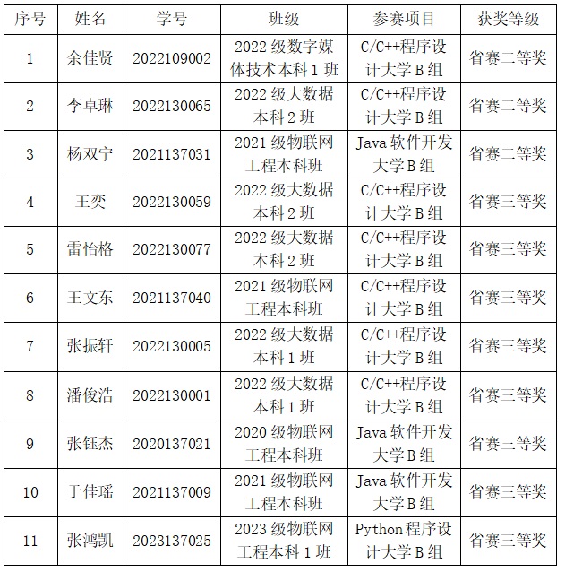 2024年4月29日,第十五届蓝桥杯全国软件和信息技术专业人才大赛软件类省赛的比赛结果刚刚揭晓,详见比赛官方网址https://dasai.lanqiao.cn/notices/1615/。bat365信息工程学院共有11名学生获奖。具体获奖名单如下: