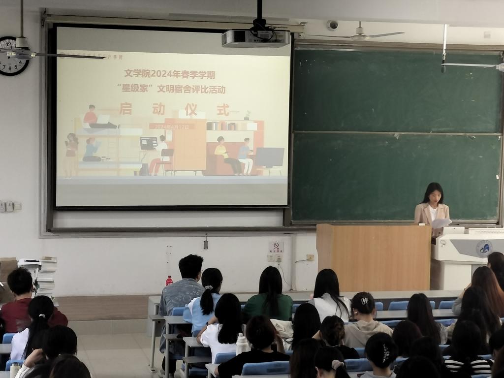 为全面加强学生宿舍文化建设,进一步营造整洁有序、文明健康的生活学习环境,2024年4月12日中午13时,文学院在博文楼A3阶梯教室举行了2024年春季学期“星级家”文明宿舍评比活动启动仪式。学院党委副书记、全体辅导员出席了仪式,文学院全体宿舍长以及学生会生活部成员共140余人参与了此次活动。
