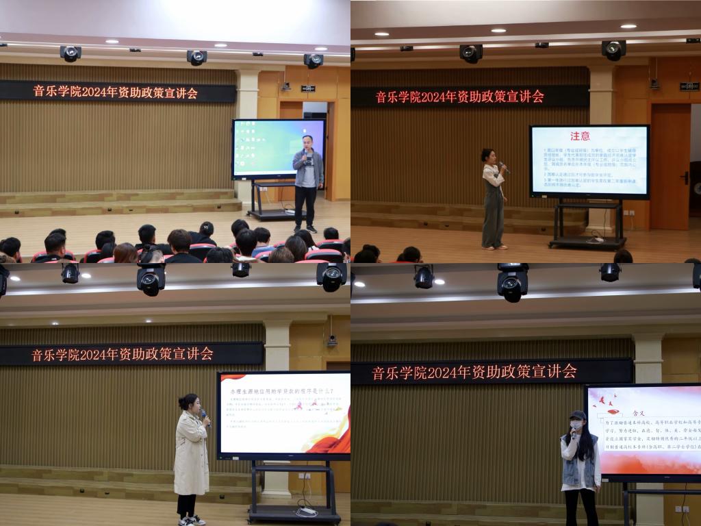 为进一步加强资助政策的宣讲力度,充分发挥资助工作的育人功效,确保同学们全面了解资助政策,更好地帮助家庭经济困难的同学顺利完成学业,音乐学院于4月9日晚在大学生艺术教育活动中心召开资助政策宣讲会。本次宣讲会由辅导员张暾老师主持,学院党委副书记出席会议并讲话,23级全体学生参加。