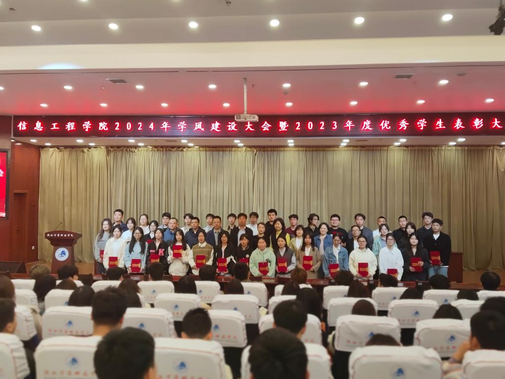 为彰显优秀学子榜样作用,扎实推进学院学风建设,形成“教师善教、学生乐学、学风浓郁”的良好氛围,信息工程学院于2024年4月1日下午在图书馆学术报告厅举行2024年学风建设大会暨2023学年优秀学生表彰大会。信息工程学院全体领导班子、各系主任、全体辅导员、全体学生干部及部分学生代表近400余人参加会议,会议由学工办主任主持。