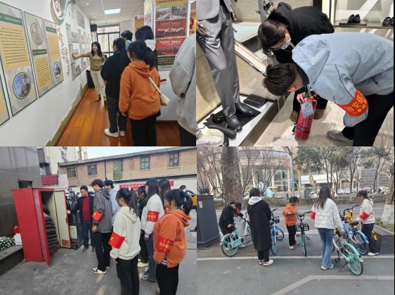 在社区工作人员赵娟和彭奕涵的带领下,我院团员青年先在小寨西路社区退役军人服务站进行了参观学习,了解了退役军人服务站的机构设置、服务职能和工作模式,参观学习了在解放战争和抗美援朝战争中做出过重大突出贡献的退役军人事迹。随后,我院师生配合社区工作人员,以安全员的身份对小寨西路片区进行安全巡查,走访了街道商铺,排查店铺内灭火器是否规范配备,是否有安全隐患,对店员进行了正确使用灭火器培训,重点巡查了皇家公馆、地税小区等居民区的电动车充电情况,查看地库防汛物资配置是否齐全。在活动往返途中,同学们沿路整理了所有无序摆放的共享单车,充分发扬了雷锋精神,受到了社区工作人员的赞许和好评。