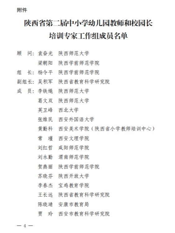 近日,省教育厅下发了《陕西省教育厅办公室关于陕西省中小学幼儿园教师校园长培训专家工作组换届的通知》(陕教师办〔2024〕4 号),成立陕西省第二届中小学幼儿园教师校园长培训专家工作组,bat365四人成功入选。其中梁朝阳入选工作组顾问,杨令平入选专家工作组组长,贺燕丽、李媛入选专家工作组成员。