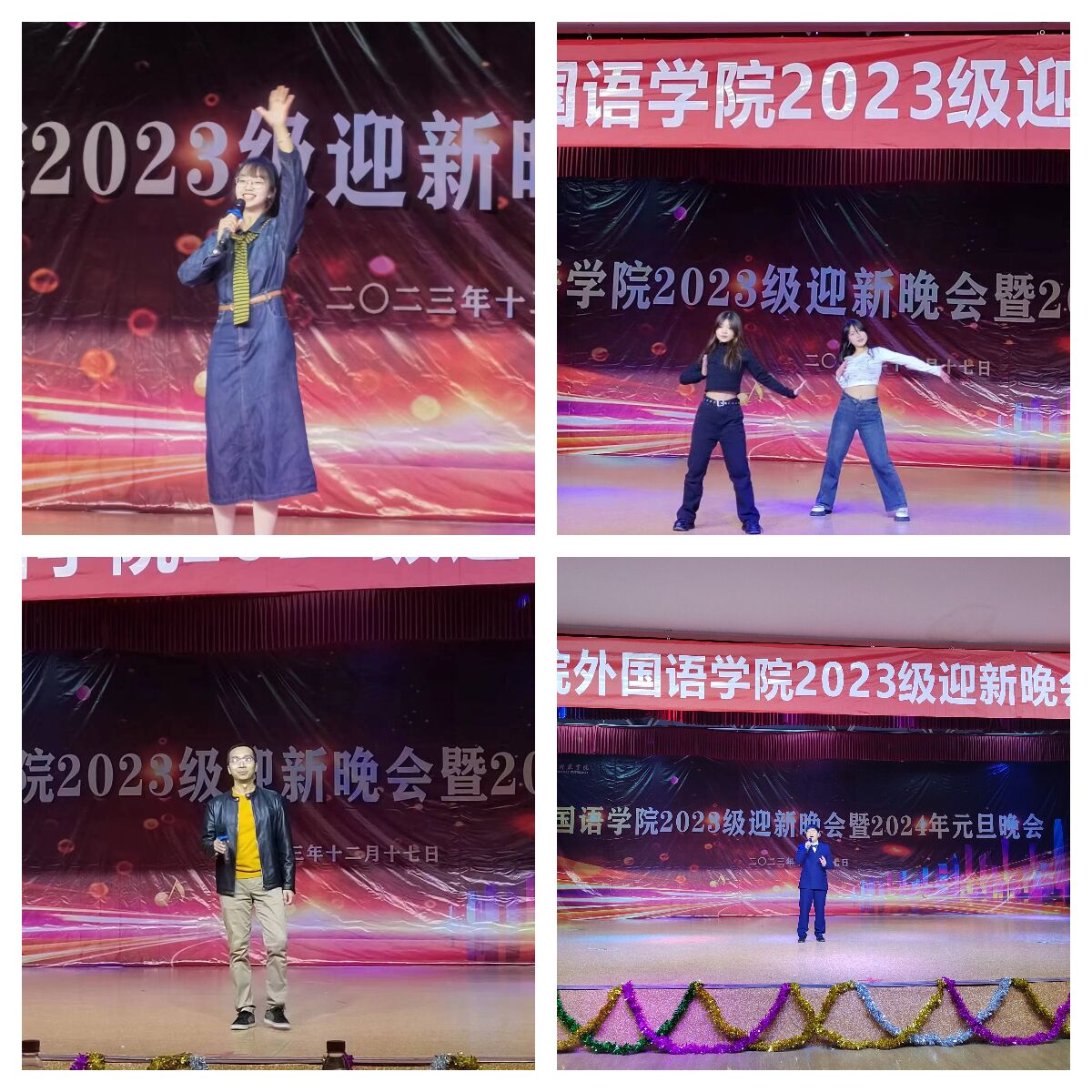12月17日晚,外国语学院2024年元旦联欢晚会在大学生活动中心成功举办。学院党委书记高海燕、副书记侯文彬、部分教师代表及辅导员、200余名学生一同观看了晚会。