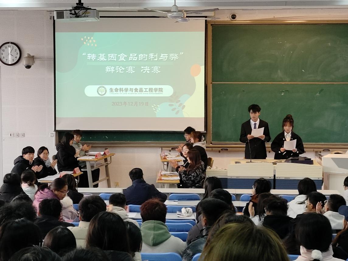 为提升学生对食品安全的科学认知,增强学生社会责任感,锻炼学生逻辑思维能力,培养团队合作意识,2023年11月至12月,生命科学与食品工程学院举办了第二届食品安全辩论赛——转基因食品的利与弊。经历了前期的海选、初赛,决赛于12月19日在2教A3阶梯教室火热开展。参加本次辩论赛决赛的评委老师有学院相关领导、专业教师和辅导员老师。