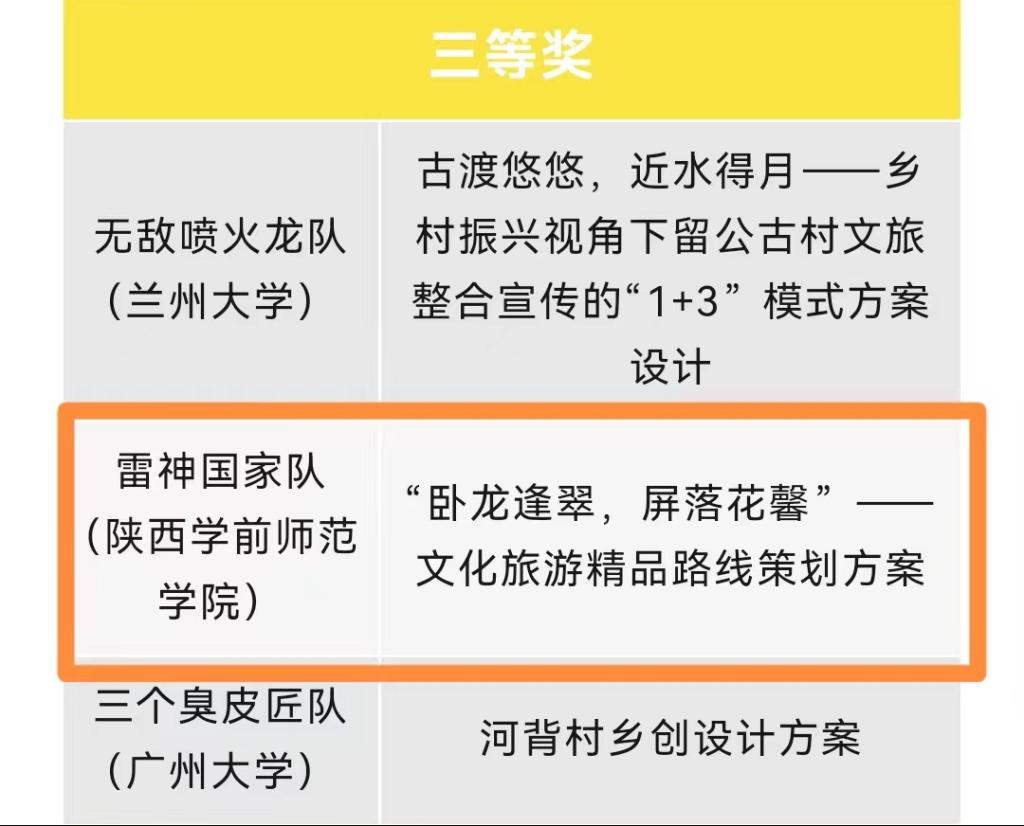 历史文化与旅游学院学生董明妃、阳易江、堪科宇三位同学组成的雷神国家队提交的“卧龙逢翠,平落华馨——文化旅游精品路线策划方策”喜获阳朔专项单元三等奖。