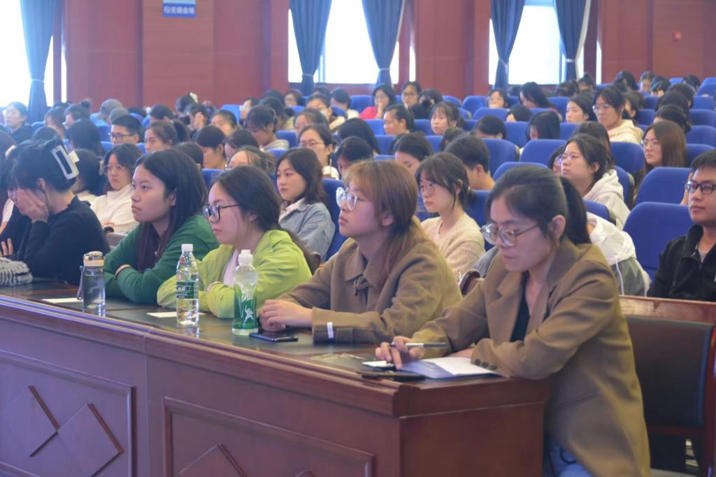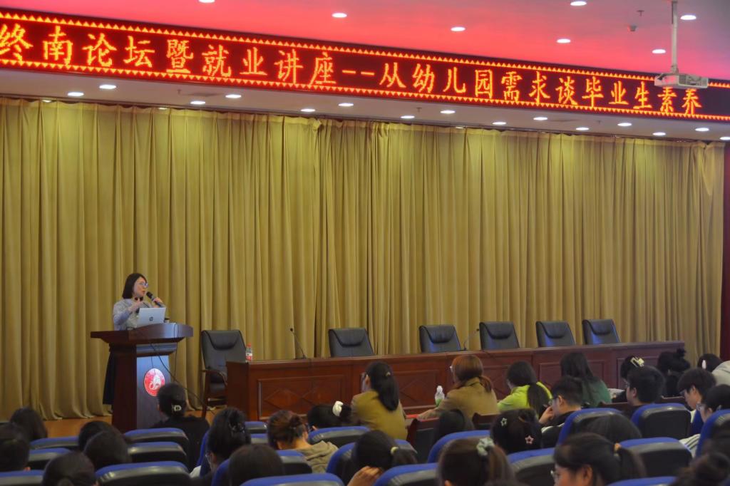 为促进2024届学前教育专业毕业生高质量就业,帮助毕业生了解幼儿园对教师的需求,做好充足的就业准备,2023年10月16日下午,幼儿教育学院终南论坛特别邀请西安高新区第十三幼儿园、第四十五幼儿园、第五十八幼儿园党支部书记、园长,陕西省首批学科带头人,陕西省幼儿园教学能手潘睿园长在图书馆报告厅为2024届毕业生做题为“从幼儿园需求谈毕业生素养”的专题讲座。幼儿教育学院毕业班辅导员及400余名毕业生聆听了讲座。讲座由学院党委副书记苏群主持。