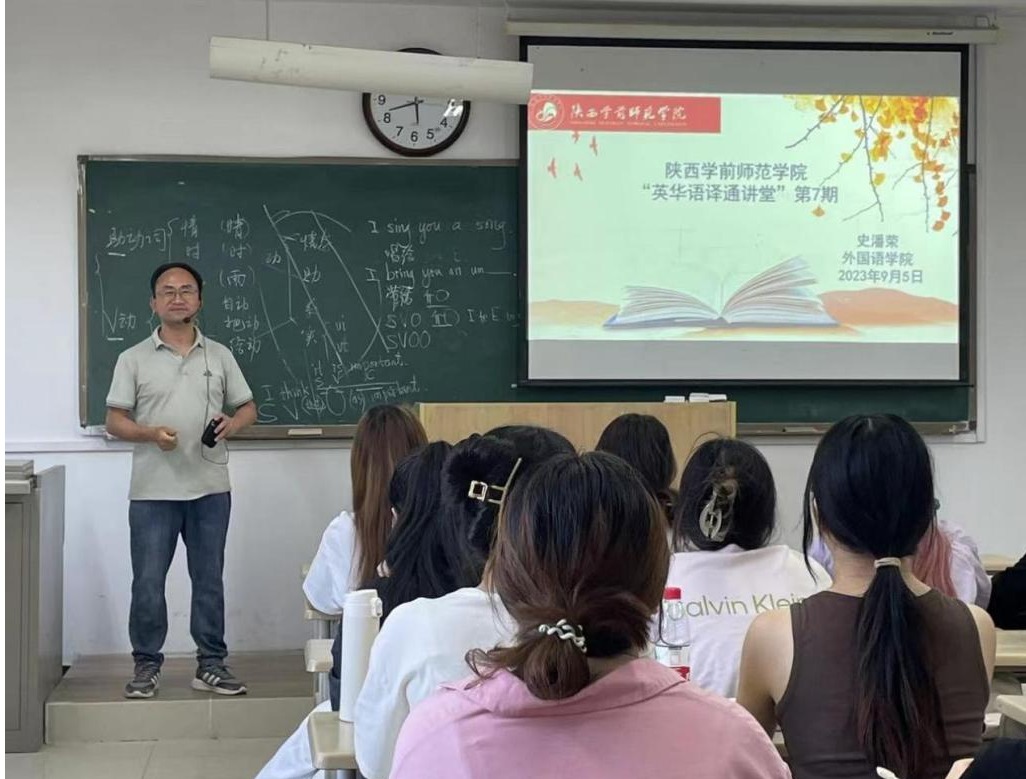 2023年9月5日,bat365中文官方网站外国语学院举办“英华语译通讲堂”第7期讲座,主讲嘉宾为中国国学双语研究会会员、陕西译协理事、西京大学史潘荣老师。史老师结合汉英笔译实践翻译任务,对翻译主体、翻译方法、翻译类型、翻译目的等方面进行了针对性讲授,21级、22级翻译系全体本科生在现场聆听报告。讲座由翻译系主任吴迪老师主持。