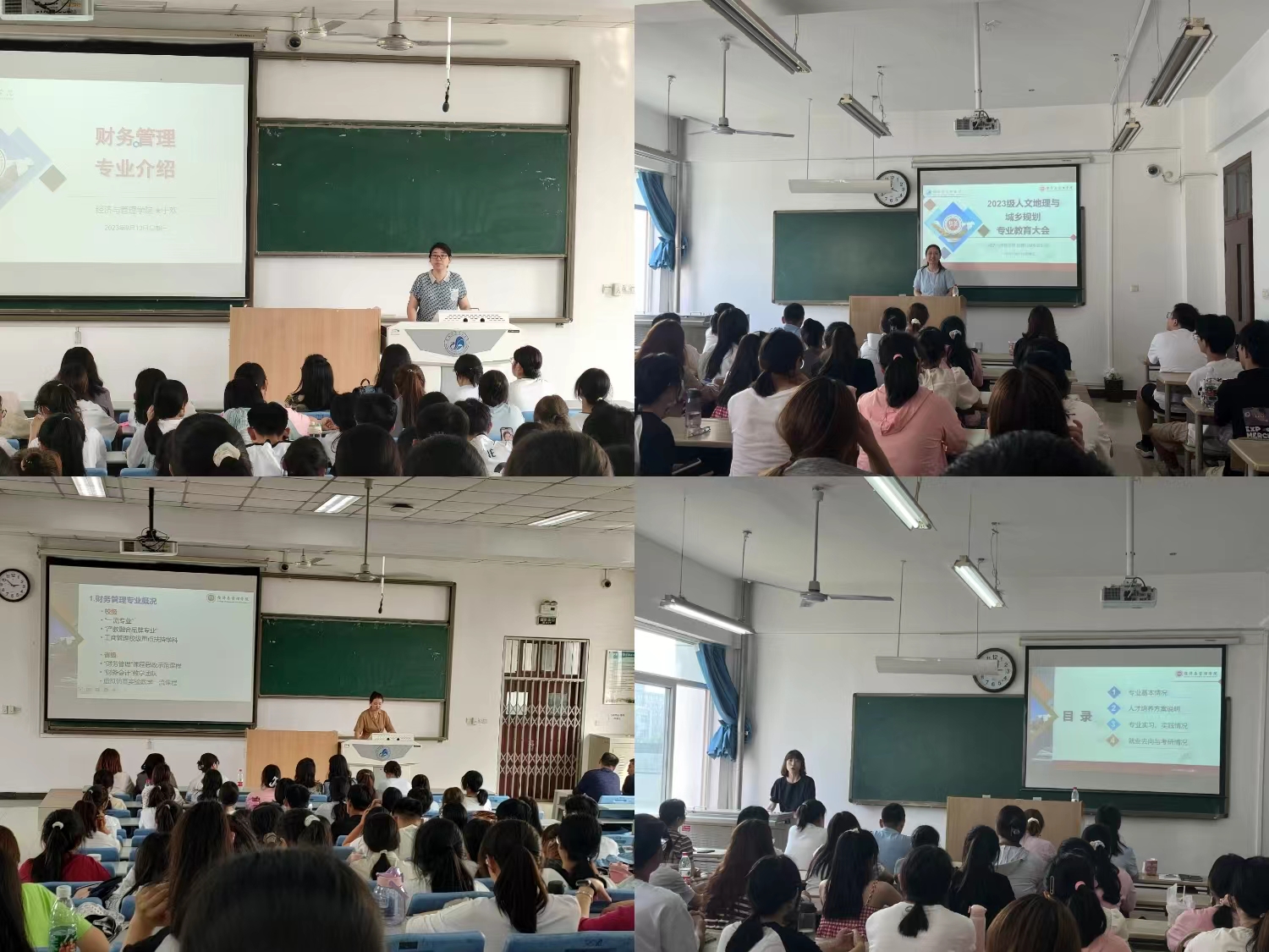 为指导和帮助2023级新生增进专业认知,明晰成长目标,尽快适应大学学习生活,在入学教育大会结束后,学院开展了专业教育系列活动。财务管理专业教育活动在博文楼B3教室举行。财务与会计系、创新创业教育教学研究中心全体教师以及财务管理专业2023级新生参加了此次活动。财务与会计系于欢老师从专业发展、课程设置、人才培养等方面系统介绍了财务管理专业,并给予了新生合理化的学习建议。副院长刘家瑛从专业学习的角度出发鼓励同学们开拓眼界、树立远大志向、培养专业思维,努力在大学四年的学习中奠定良好的专业基础。人文地理与城乡规划专业教育活动在博文楼B405教室举行。学院副院长陈秀端、系主任徐晗以及地理与城乡规划系全体教师、2023级人文地理与城乡规划专业新生参加了此次活动,活动由李妮副教授主持。地理与城乡规划系主任徐晗老师、青年教师贾凌云等依次为新生们详细介绍了人文地理与城乡规划专业的师资力量、专业特色、人才培养方案、专业规划、发展前景、资格证书考取等一系列重要内容,希望能够帮助学生们树立专业信心,做好学习规划。副院长陈秀端对新生提出三点期许:一要志存高远、笃定目标,规划好专业课程学习;二要勇于探索、敢于尝试,争做时代先锋;三要脚踏实地,知行合一,用行动创造属于自己的人生精彩。