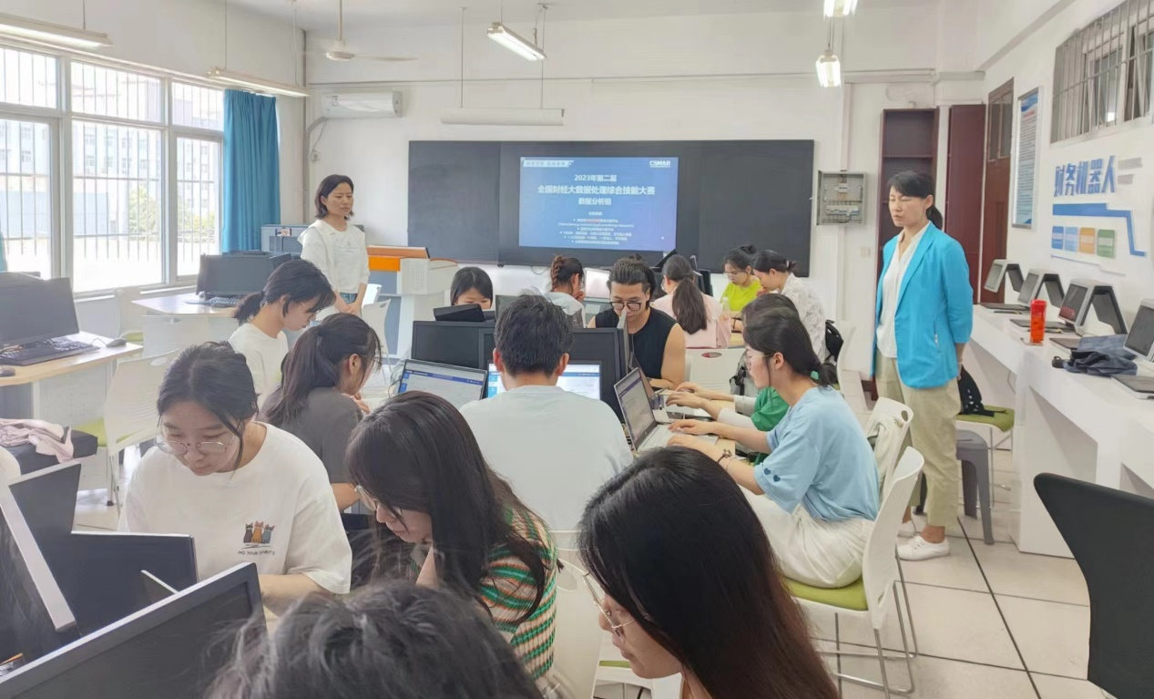 经济与管理学院积极组织安排学生组队报名、赛前培训等工作,并开放实验室用于日常训练和比赛。在经济与管理学院孙军娜老师、信息与工程学院张敏等老师为期一个月的指导下,在同学们夜以继日的刻苦训练和团结协作下,最终有6支队伍18名学生挺进国赛。国赛采用线上比赛的形式,在经济与管理学院智慧云财务综合实训室进行,比赛现场紧张有序,在学生们共同努力下取得了优异的成绩。