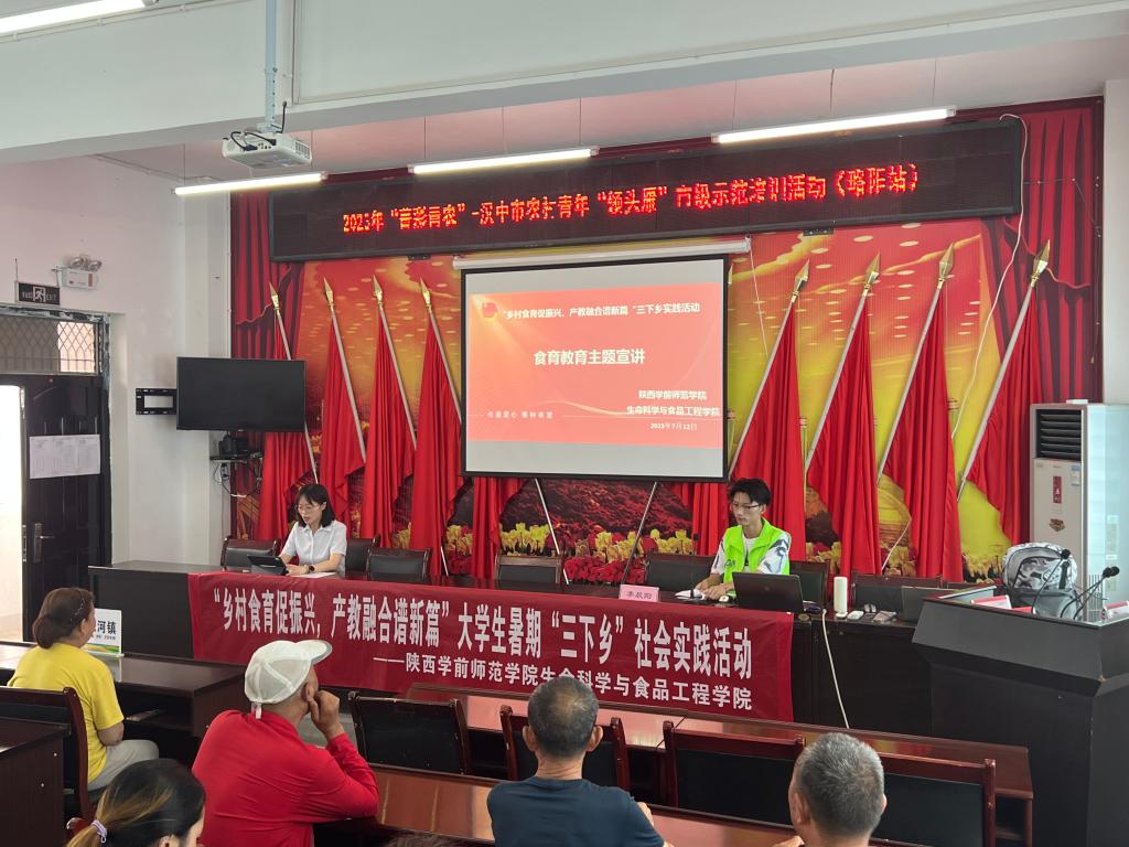 为深入贯彻习近平新时代中国特色社会主义思想,全面贯彻党的二十大精神,2023年7月12 日中午,生命科学与食品工程学院“乡村食育促振兴,产教融合谱新篇”“三下乡”实践队,在略阳县金家河镇政府开展食育教育讲座,实践队队员李晨阳面向60余位村民群众,通过现场授课及讲解,让村民们了解了食育的重要性,以及如何践行食育教育。本次活动由略阳县团县委、金家河镇团委和bat365中文官方网站生命科学与食品工程学院实践队共同承办。