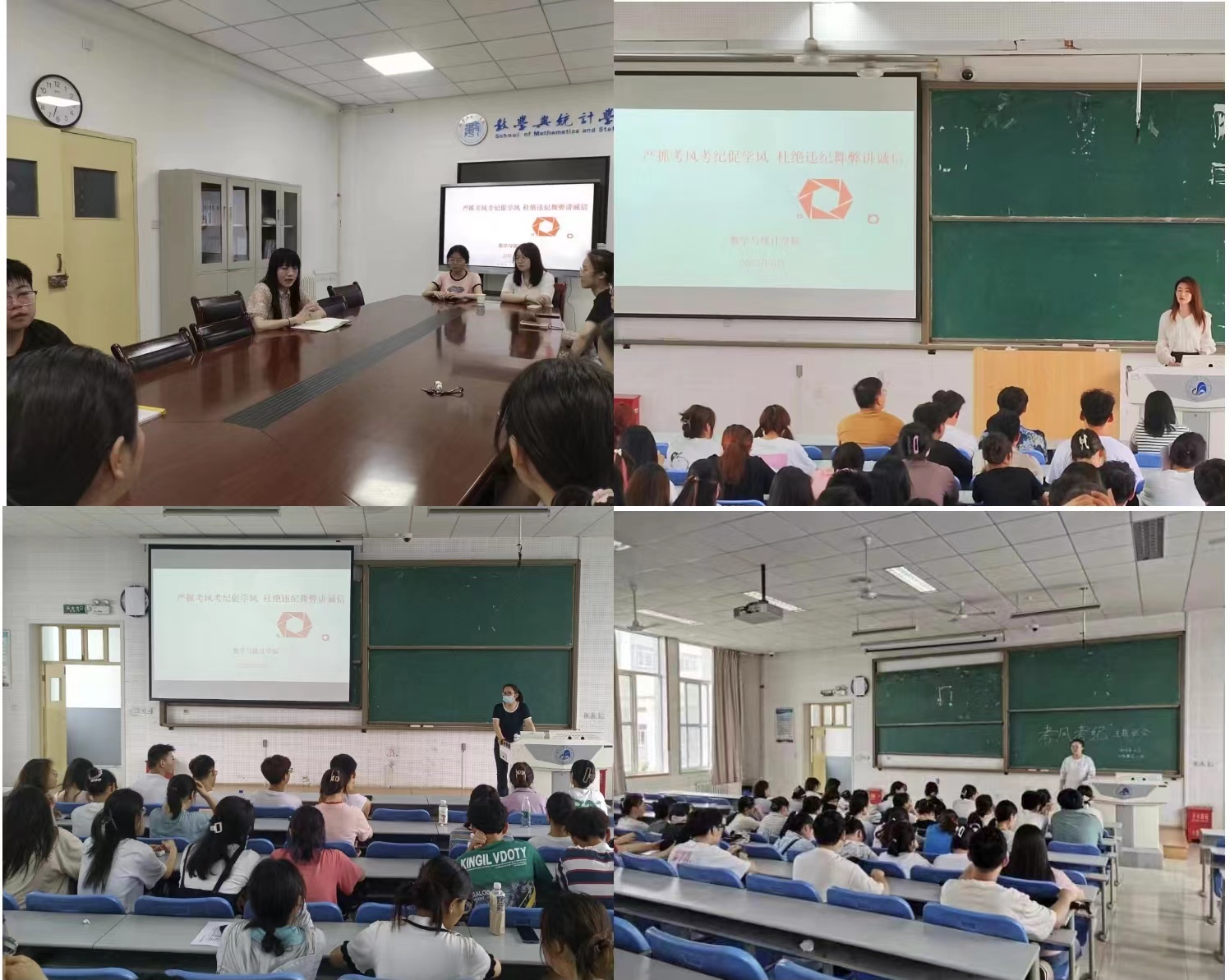 为严肃考风考纪,落实学校关于加强学风建设的要求,培养学生诚实守信的优良品德,确保学生在各类考试中遵守考试纪律,以良好考风促进优良学风,6月中旬以来,数学与统计统计学院在各年级分别开展“严抓考风考纪促学风 杜绝违纪舞弊讲诚信”考风考纪主题教育。