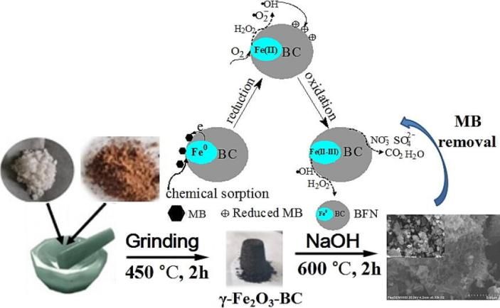 近期,bat365中文官方网站化学化工学院吴永娟副研究员课题组在国际期刊《Bioresource Technology》(一区,top, IF:11.889)发表了一篇题为“Effective removal of methylene blue with zero-valent iron/tea residual biochar composite: performance and mechanism”的研究论文。吴永娟副研究员为第一作者和通讯作者,第二作者为我院2018级本科毕业生(已考取绍兴文理学院研究生)。文章报道了一种简单、低成本合成微纳米零价铁-生物炭复合物(BFN)的方法。合成的产品可以快速、高效的处理含亚甲基蓝(MB)的模拟废水,去除MB的机理涉及吸附-还原-氧化的微界面过程(图1)。