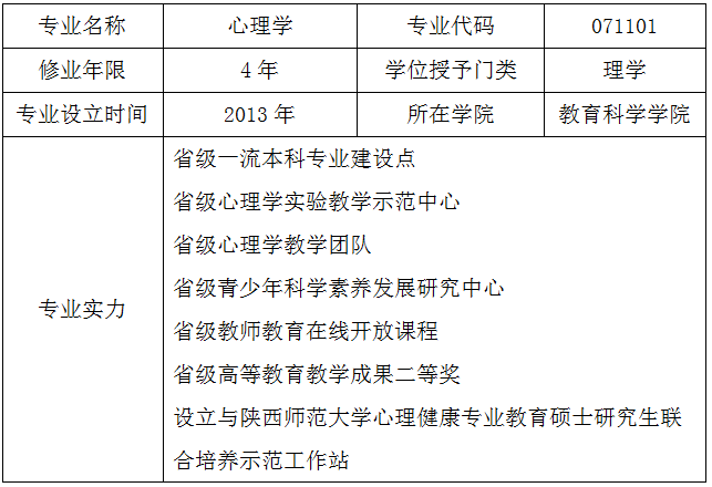 心理学专业全面贯彻党的教育方针,根据新时代教师教育高质量发展需求和基础教育改革理念,立足陕西、面向西部,旨在培养德智体美劳全面发展,思想政治素质过硬、师德师风高尚、教育情怀深厚,专业理论扎实,专业技能突出,能够胜任心理健康教育教学和教学研究的“善教学、会辅导”的中学心理健康教育教师。