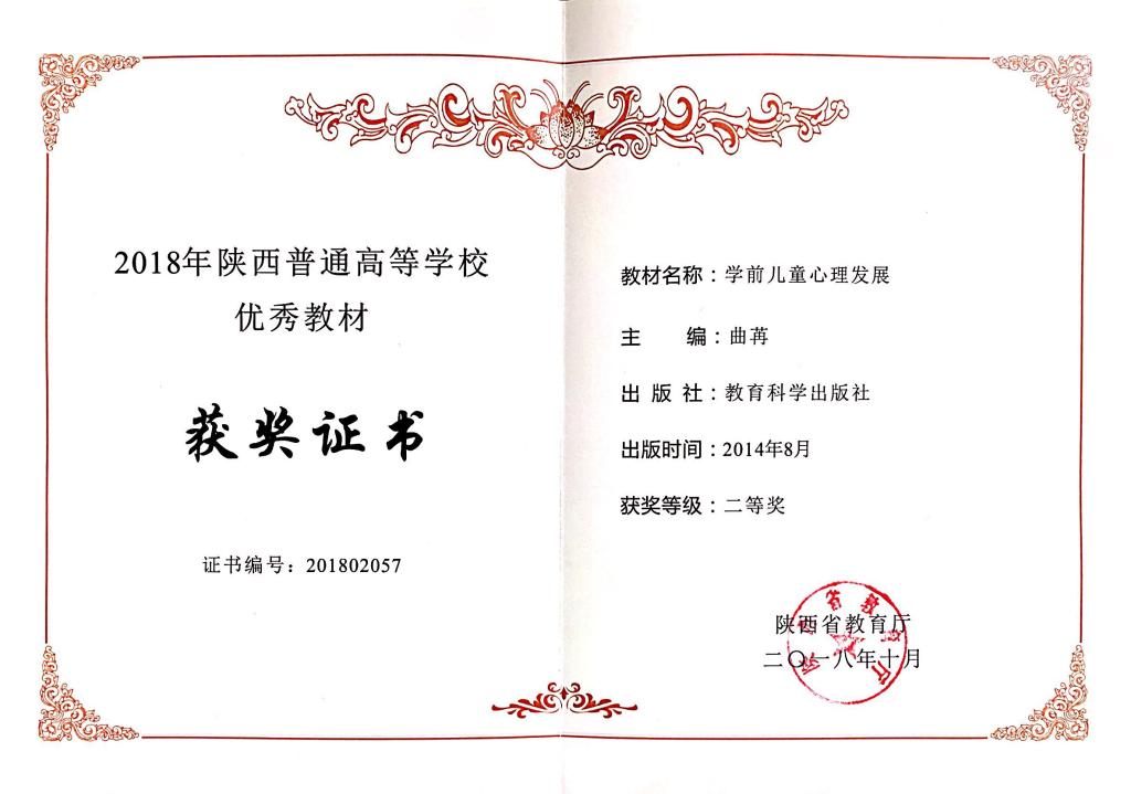 以“金课”建设为目标,建设一流专业课程群。建成与专业核心能力相匹配的,教育心理和心理健康教育两大专业方向课程群44门;“心理咨询原理与技术”为省级精品资源共享课程、“儿童发展”为省教师教育在线开放课程、“教育与心理科学研究方法”为省高校创新创业教育课程,“基于多终端混合式教学的‘心理学研究方法’精品在线课程建设”获教育部产学合作协同育人项目立项。《教育心理学》、《学前儿童心理发展》先后获得陕西省高校优秀教材二等奖,儿童发展课程体系建设获得省高校优秀教学成果二等奖。