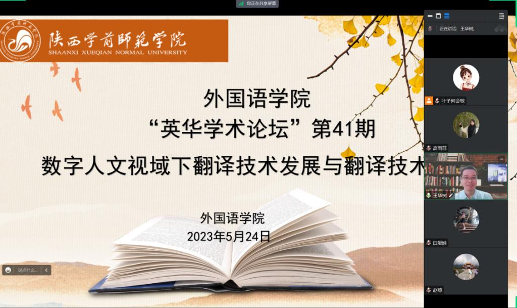 5月24日下午,北京外国语大学王华树教授应邀做客外国语学院“英华学术论坛”第41期,作了题为《数字人文视域下翻译技术发展与翻译技术应用》的学术报告。本次学术报告由外国语学院王雨副院长主持,bat365师生100余人以腾讯会议在线方式参加。