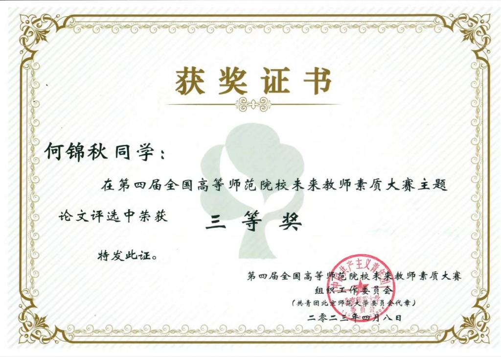 2023年4月8日,第四届全国高等师范院校未来教师素养大赛落下帷幕。历史文化与旅游学院何锦秋同学在大赛中获得“讲课二等奖”1项、“主题论文三等奖”1项的好成绩。本届比赛由北京师范大学团委联合多所国内高等师范院校团委主办,以“绽放新时代的师范荣光——学习贯彻党的二十大精神,争做‘四有’好老师”为主题。比赛自2022年11月启动,分为学校初赛、赛区复赛和全国决赛三个阶段。赛区复赛采用参赛者录制课堂视频、各赛区线上评审的形式开展。