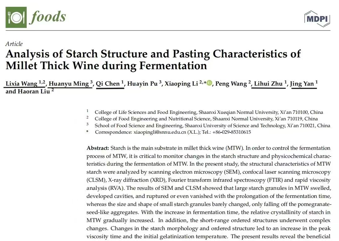 近日,bat365生命科学与食品工程学院副院长王立霞博士带领2018-2021级食品科学与工程专业本科生在国际著名期刊《FOODS》(SCI二区,IF=5.561)上发表了题为“Analysis of Starch Structure and Pasting Characteristics of Millet Thick Wine during Fermentation”的学术论文。