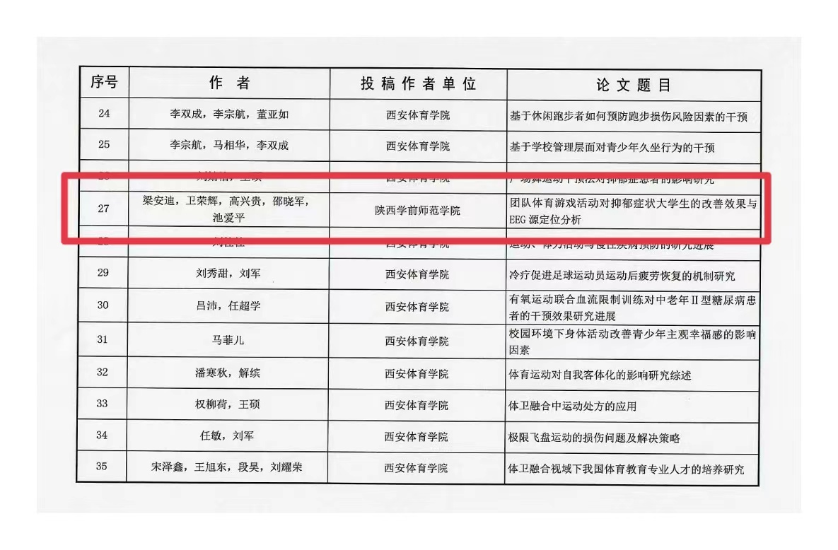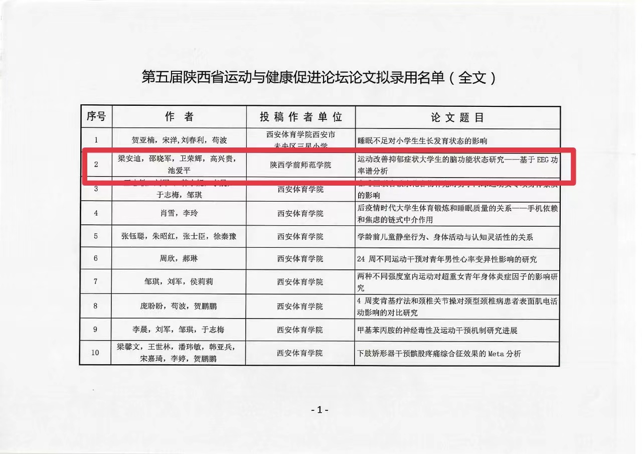 17日,第五届陕西省运动与健康促进论坛在线上成功举办,共有137篇论文参加论文类比赛,体育学院教师梁安迪、邵晓军、卫荣辉、高兴贵联合完成并提交的两篇论文均获得奖项,其中《运动改善抑郁症状大学生的脑功能状态研究---基于EEG功频谱分析》一文喜获一等奖,梁安迪老师代表团队进行了汇报交流。