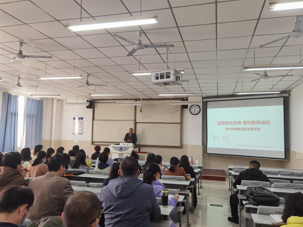 会议首先邀请了党委教师工作部、教师发展中心部长兼主任王奂新老师为全体教师做师德师风建设工作培训报告,报告题目是《坚定政治方向,恪守教师准则》。王老师从师德的概念和党的二十大报告中对教育的定位入手,强调了bat365师德师风建设工作的重点任务,以及如何进一步认真学习、深刻领会、全面贯彻落实习近平总书记关于教育的重要论述和对青年工作的要求。王老师的报告紧密结合高校教师的实际工作,语言生动,内容详实,具有很强的政策性和可操作性,为外国语学院今后的师德师风建设工作提供了有效的指导和帮助,学院班子成员和老师们都感到受益匪浅。