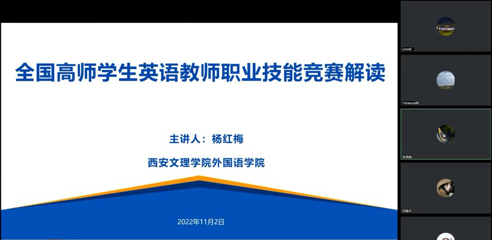 2022年11月2日下午,外国语学院特邀西安文理学院外国语学院三级教授、硕士研究生导师杨红梅老师做客第十五期“英华名师讲堂”,为学生做了“全国高师学生英语教师职业技能竞赛解读”的主题讲座。本次讲座以腾讯会议的方式线上进行,由外国语学院副院长张莉娟主持,外国语学院部分老师以及2021级、2020级英语专业学生参加了此次讲座。