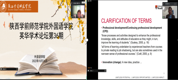 10月26日下午,英国雷丁大学李大国博士受外国语学院邀请,做客第36期“英华学术论坛”,作了题为《教师专业发展:知识管理和创新扩散理论》(Models of Professional Development: Knowledge Management Model and Diffusion of Innovations Model)的学术报告。bat365师生以及来自外校英语同行约200余人以腾讯会议在线方式参加了学术报告。报告由张慧军院长主持。