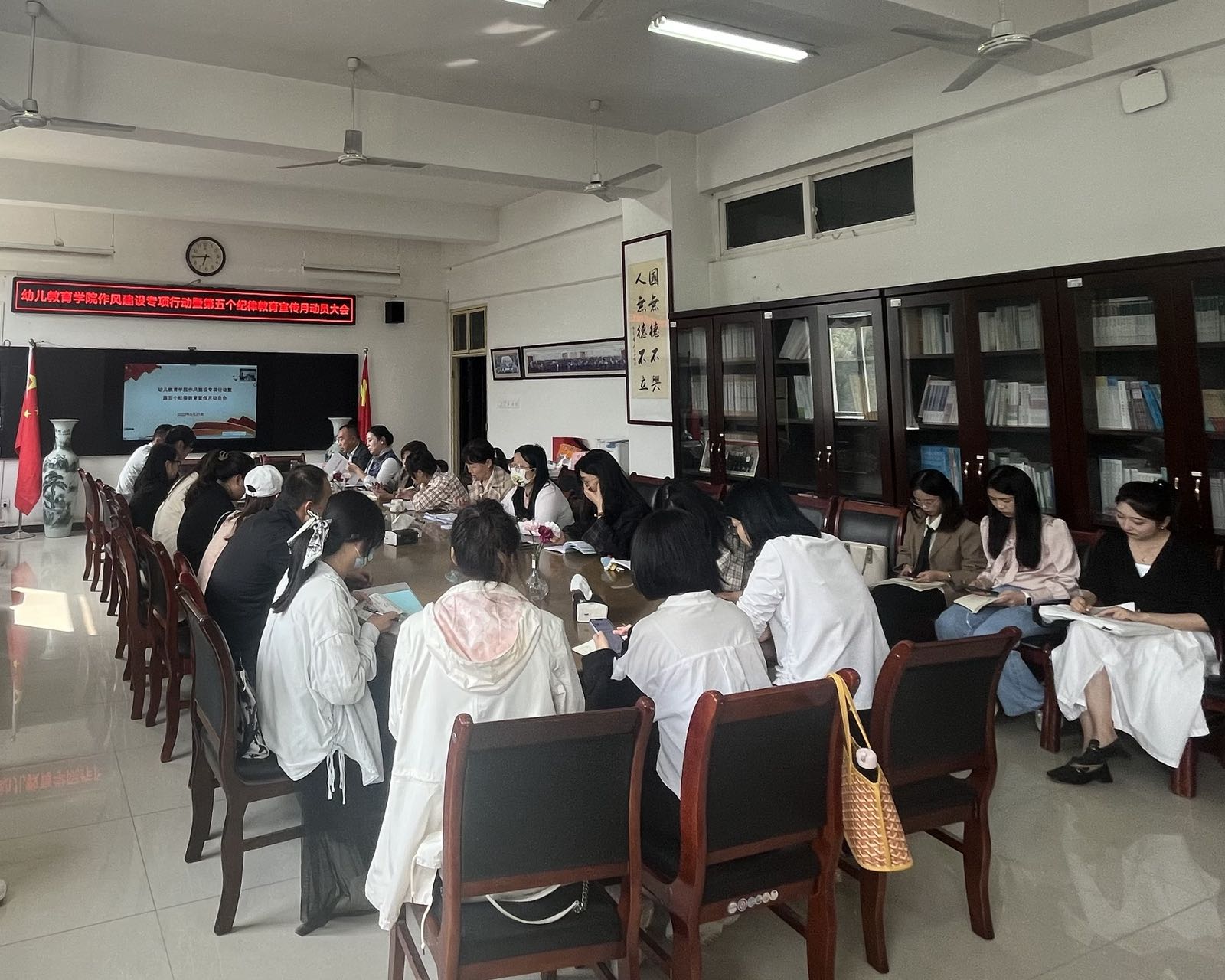 9月21日下午,幼儿教育学院召开作风建设专项行动暨第五个纪律教育宣传月全体教职工动员推进会。会议以线上线下相结合形式召开,院班子成员、各支部书记、行政人员和全体辅导员线下参会,其他教职工线上参会。会议由院党委副书记苏群主持。
