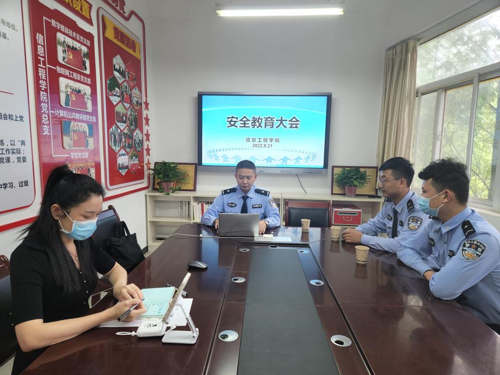 为进一步增强在校学生法制和安全观念,提高自我保护意识和能力,强化打击治理电信网络诈骗,对校园安全稳定工作做到预警防范。9月21日,信息工程学院在积学楼A202携手常宁路派出所开展“长安分局防范电信诈骗进高校”活动,召开了“安全教育大会”。会议邀请常宁路派出所杜芳鑫警官主讲,本次大会由新生辅导员主持,采取“线上与线下”相结合的形式,学工办主任和辅导员及2022级全体学生参加。