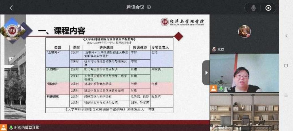 经济与管理学院高度重视2021级本科生的《创业基础》和《大学生科研训练与双创项目申报指导》两门公共课的教学任务,专门召开全体教师大会,详细说明了创新创业教育的重要意义和课程规划,鼓励有经验的优秀教师积极参加,遴选课程负责人组建课程团队。