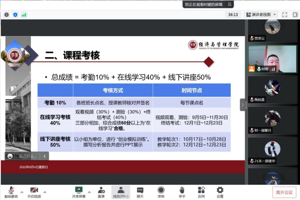 根据学校开学部署,教学初期暂时进行在线教学。面对2021级2400余人次学生的在线教学任务,提前做好周密的安排尤为重要。创新创业教育教学研究中心老师们经过研讨和认真准备,在教务处协助下,于9月4日下午给2021级本科69个班的班委召开了一次在线的课程说明会,由《创业基础》课程负责人寇超老师和《大学生科研训练与双创项目申报指导》课程负责人时媛老师针对两门课程的课程计划、考核方式和分班情况分别做以详细说明,建立并公布了授课教师QQ群、2021级学生班委QQ群、17个大班QQ群和各班在线教学的腾讯会议号。经过开学前周密的部署,开学第一周的创新创业在线教学工作有序平稳地进行。