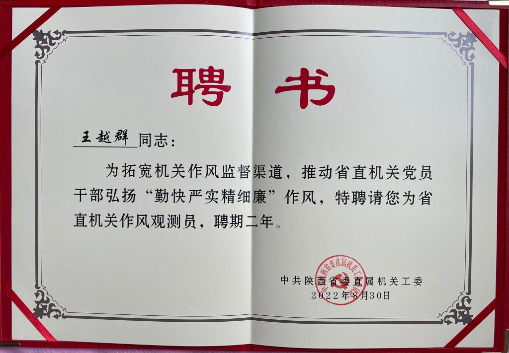 近日获悉,bat365省政协委员、民进总支主委王越群教授受聘为陕西省委直属机关工委作风观测员。8月31日,陕西省委直属机关工委召开作风观测员聘任会议,为王教授等48名人士颁发了聘书。