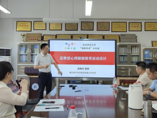 首先,段海军教授进行了“课程思政”示范课《班主任心理健康教育》的说课汇报,重点以《思维型心理健康教育活动设计》为例,带来了一堂引人入胜的精彩展示,从课程理念目标、教学创新痛点问题、创新路径和教学设计思路等方面进行了深入讲解与分享。