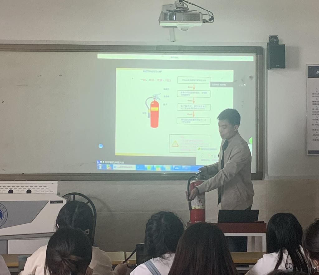 最后,张老师使用401主会场的灭火器向大家演示了其使用方法,幽默的讲解加上扎实的实战演练博得了师生的阵阵掌声。