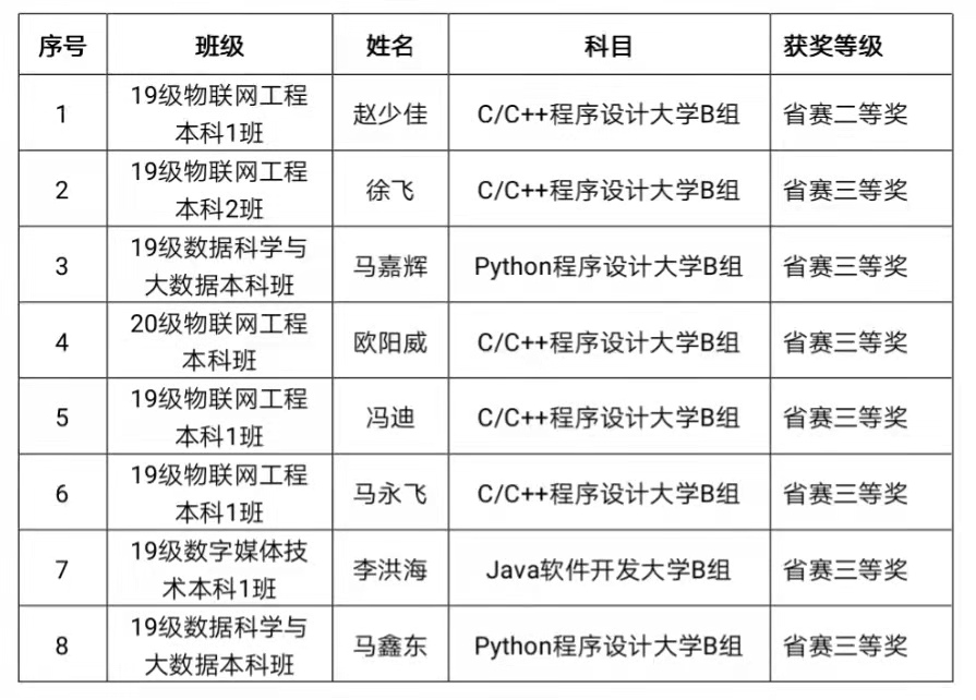 2022年4月28日,第十三届蓝桥杯全国软件和信息技术专业人才大赛个人赛省赛的比赛结果揭晓。bat365信息工程学院共有8名学生获奖。具体如下: