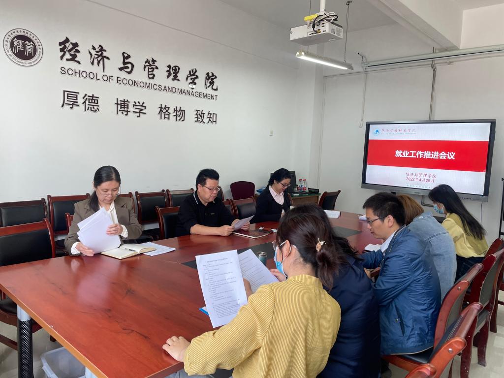 2022年4月25日上午,经济与管理学院就业工作推进会在学院会议室进行,经济与管理学院党政领导班子成员、全体辅导员、各系系主任参加会议。
