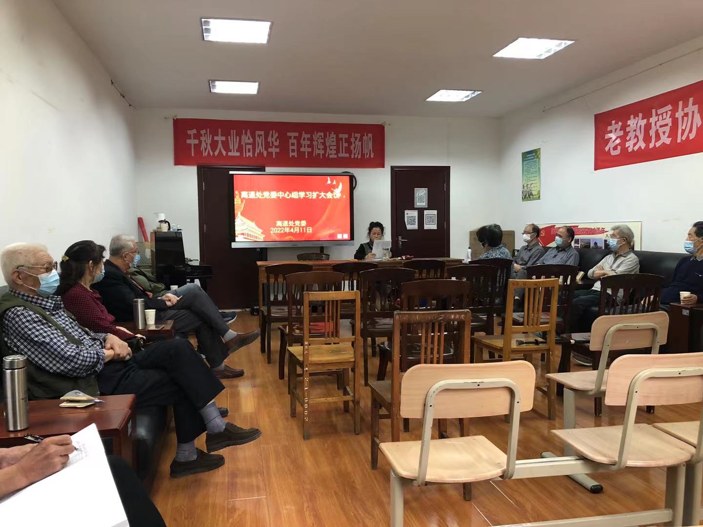 2022年4月11日下午,bat365离退休工作处党委在雁塔校区离退处老年会议室组织召开了校情通报会暨中心组扩大学习会议,离退处党委中心组成员、离休老同志和民主党派人士代表、部分退休校级领导、离退处党政班子以及工作人员共计16人参加了会议,会议由离退休工作处处长兼党委书记邸小燕同志主持。