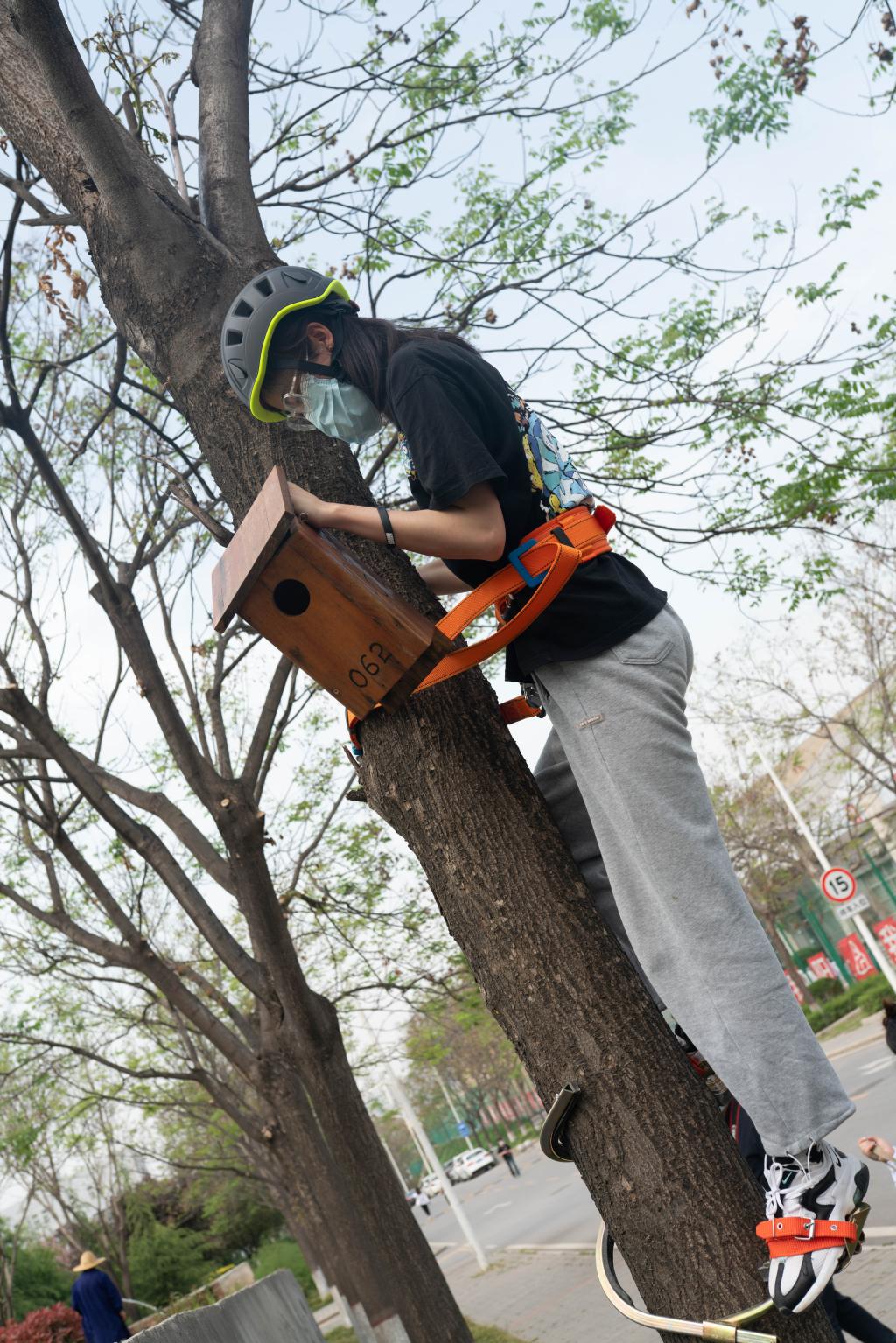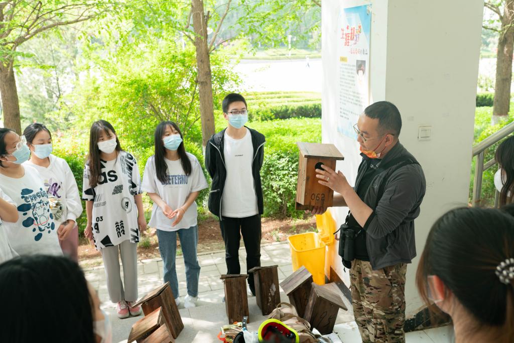 在活动中,学生们首先了解了校园常见鸟类的形态特征和分布规律,以及人工鸟巢箱的类型、结构和功能。接着在唐施翼老师的示范和指导下,大家很快掌握了人工鸟巢箱挂置的选址和操作要领,最终成功将20多个野生鸟类繁殖巢箱分别挂置在bat365行政楼和教学楼旁鸟儿活动最频繁区域。