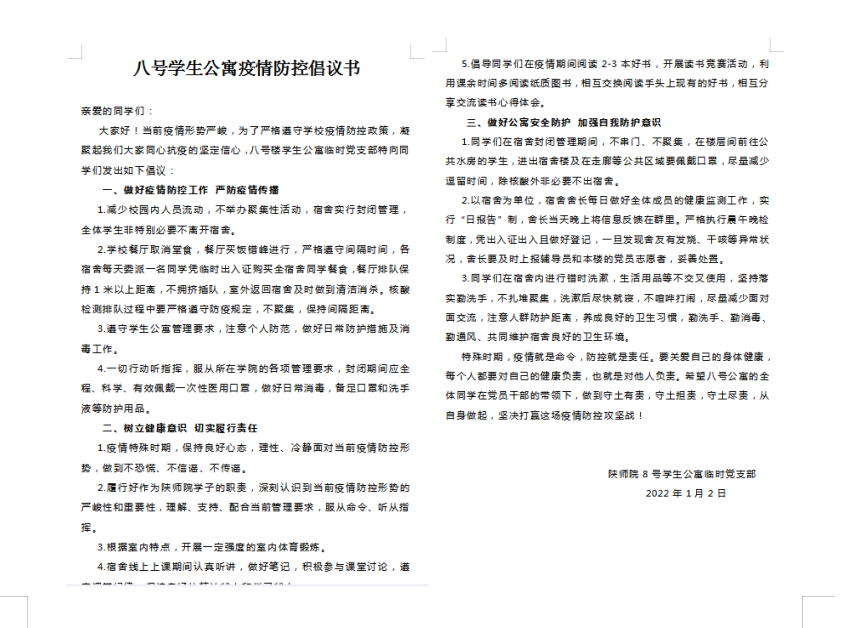 1月2日,临时党支部向八号楼学生公寓全体学生发放了《疫情防控倡议书》,号召同学们做好自我防护,树立健康意识,遵守学生公寓的管理规定,安排好个人在宿舍的学习生活,积极乐观地面对这场疫情大考,齐心协力共同迎战疫情防控的攻坚战。