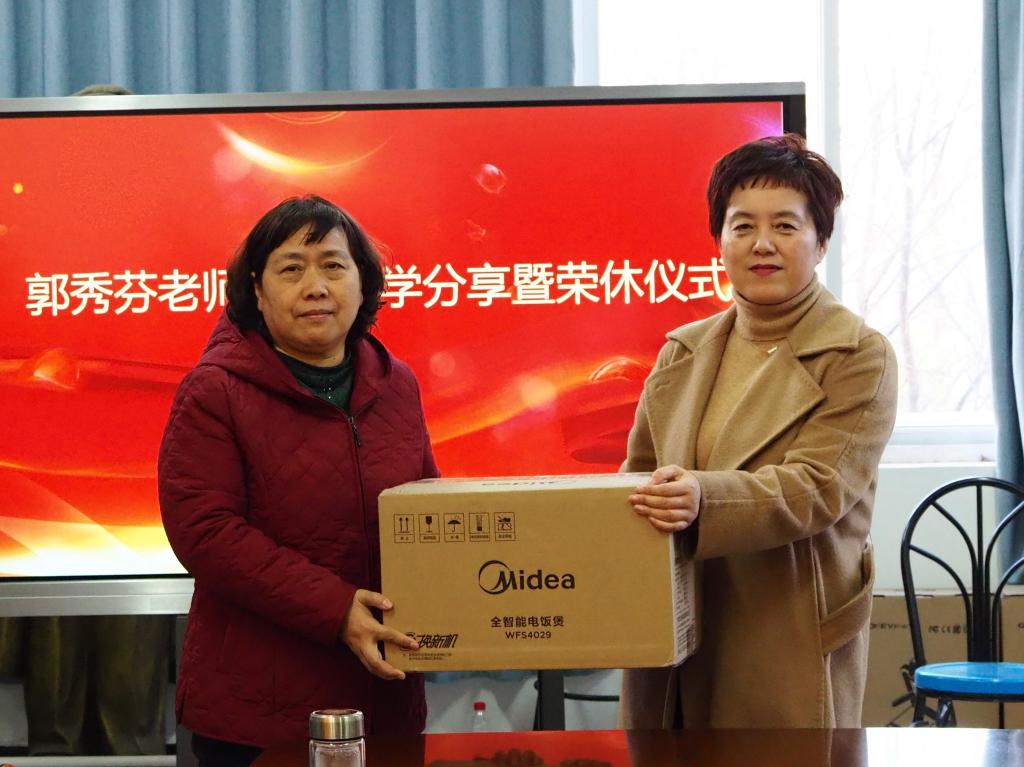 座谈会的最后,学院领导和工会主席为退休教师送上鲜花及纪念品并祝愿郭秀芬老师生活幸福、身体健康。