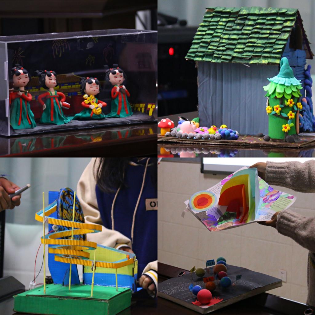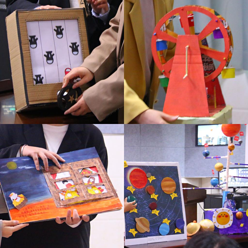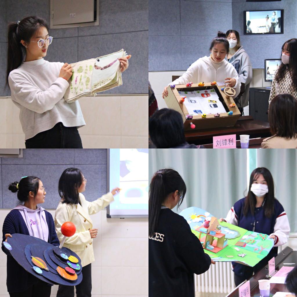 比赛过程中,选手运用PPT演示、视频动画、实物展示等多种方式,对27项入围决赛作品从设计思路、制作材料、功能特点、教育价值等方面展开了精彩纷呈的汇报讲解。学生通过植物拓印、立体折纸、平面粘贴等形式创编了《小黑鱼》、《丑小鸭》等经典绘本;《歼灭敌机》、《百变小屋》、《疯狂的赛车》等益智类玩教具充分体现了锻炼儿童多感官操作探索的设计意图;《小小影子坊》、《方盒变变乐》、《神奇城堡》、《宇宙家园》等生动、直观地表达了声、光、电、力等趣味科学概念;《唐宫夜宴》和《勺子》以中国传统文化为题材呈现出了精美、别致的艺术作品……最终,大赛秉承公开、公平、公正的原则共评选出一等奖2项、二等奖5项、三等奖8项。