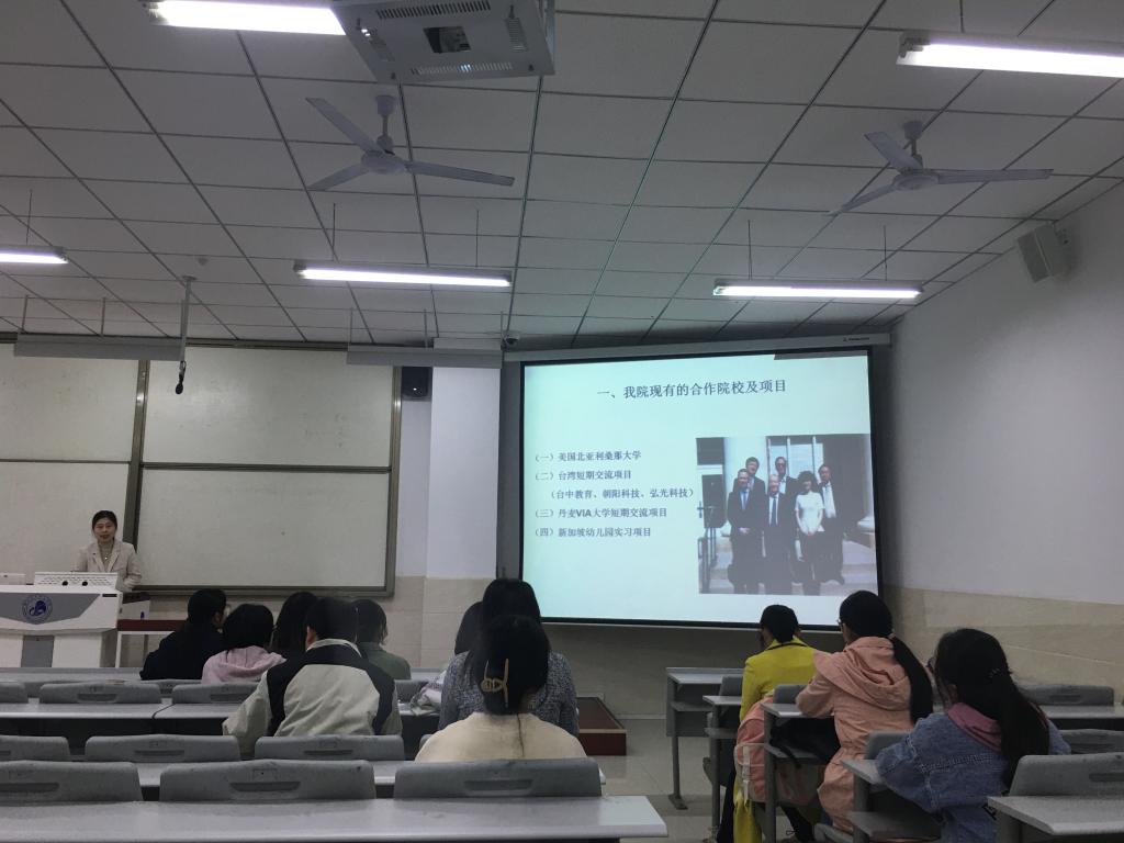 国际处工作人员首先介绍了bat365现有的合作院校概况、项目具体内容、申请流程、相关费用。随后重点介绍了美国北亚利桑那大学的“2+2”双学位项目、丹麦VIA大学学院的短期交流项目、三所台湾大学的合作项目以及新加坡就业项目。最后展示了一些留学生的生活剪影和学习体验,加深学生对国境外交流学习的认识和了解,激发了学生参加国际交流的热情和兴趣。