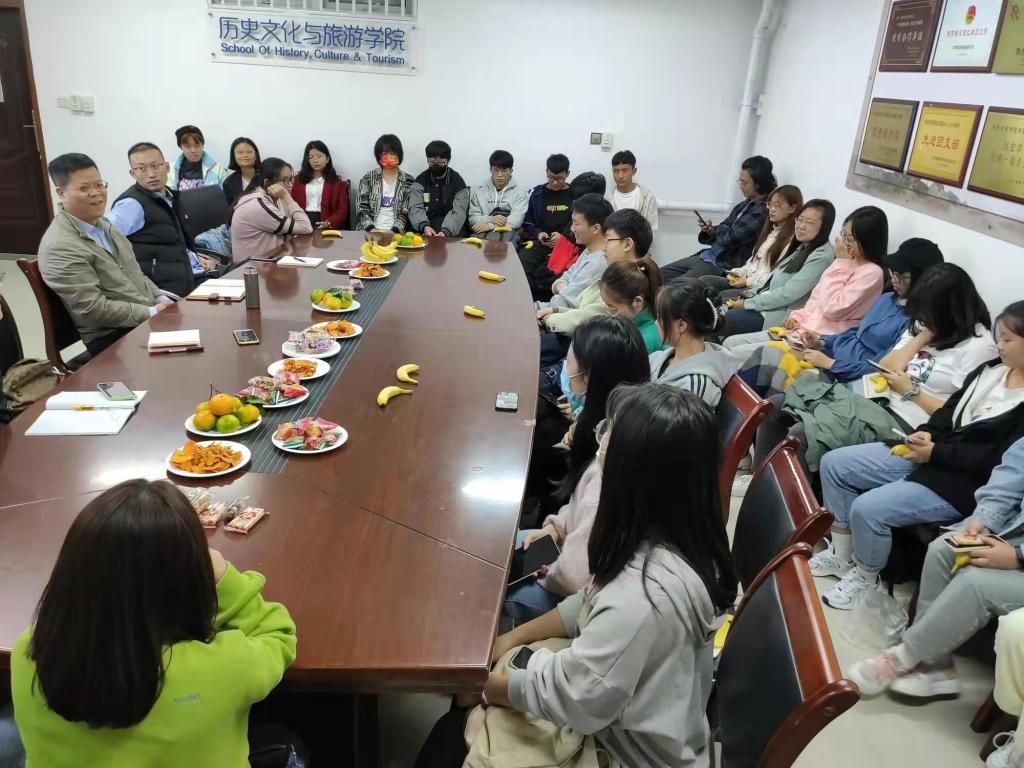 国庆节期间,为庆祝新中国成立72周年,了解学生思想、学习、生活方面的动态,促进少数民族同学之间的交流融合,历史文化与旅游学院于10月4日晚在1教B202会议室召开了以“爱国情·强国志·报国行”为主题的外省籍及少数民族学生座谈慰问会。学院党委书记童广运,副书记景艳,学生党支部书记、学工办主任王黎,2021级辅导员任柏阳及2020级、2021级外省籍和少数民族同学共计30余人参加座谈会。座谈会由学院党委副书记景艳主持。