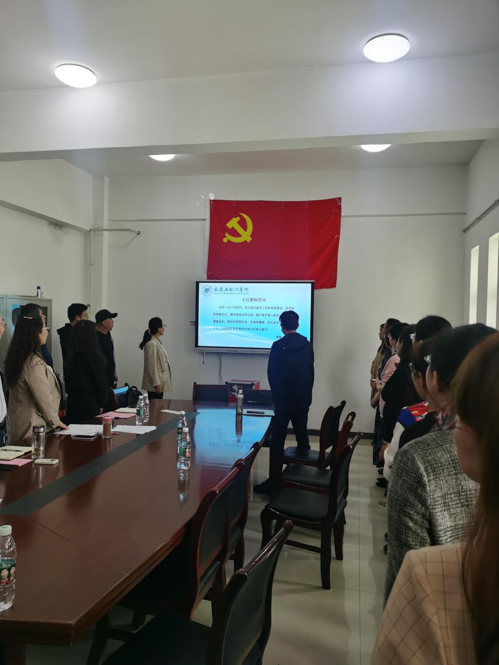数统院副院长丁剑洁副教授带领全院教师重温人民教师誓词,庄严宣誓,承诺要忠诚于人民的教育事业,贯彻党的教育方针,遵守教育法律法规,履行教书育人职责,引领学生健康成长,做到有理想信念、有道德情操、有扎实学识、有仁爱之心,为实现中华民族伟大复兴而努力奋斗!