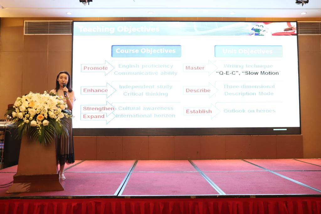 其次,空军工程大学的周俊萍副教授展示了大学英语课程思政课例。周老师介绍了课程的教学环境、教学目标以及具体的教学设计,然后再现了课堂上授课的具体环节。周俊萍副教授以外研社新视界大学英语第四单元“The Power of Heroes”为例进行了课例展示。课堂上,周老师带领学生对中国的英雄和西方的英雄进行比较,引出了西方的个人英雄主义和中国的集体主义。以古代的大禹,现代的雷锋、张思德、焦裕禄和当代的钟南山、肖思远等中华民族的英雄为例,在精神上指引当代大学生为了中华民族复兴事业而奋斗。整个课程展示环环相扣,课程思政水到渠成。她的精彩示范让与会的师生领略了“外教社杯”全国高校外语教学大赛和外研社“教学之星”中国外语学界这两大赛事双料一等奖获得者的风采,她的教学激励着年轻教师朝着追求创新教学、高效课堂迈进的步伐。