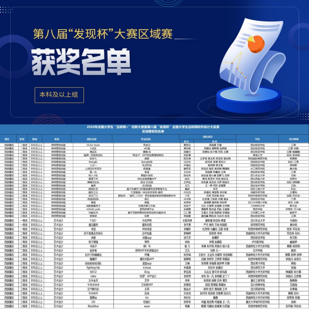 2021年4月29日,第八届全国大学生“互联网+”创新大赛暨“发现杯”全国大学生互联网软件设计大奖赛区域赛获奖名单公布,我院学子在学院领导的大力支持下、教师的悉心指导下,从西部本科高校中脱颖而出,5支团队分别获得一等奖1项:《何地寻迹》(指导老师:张秀、邓志龙)、二等奖2项:《醉铅华—“国风二次元”美妆穿搭定制网络营销策划书》(指导老师:田甜、邓志龙);《墨池书韵APP》(指导老师:李晓丹、徐思丹)、三等奖2项:《“佑芽”APP设计》(指导老师:李晓丹、王梦蝶);《wave》(指导老师:刘闫锋、邓志龙)。其中,2019级李耀彤、杜思雨、马鑫东、王颖、李莹团队设计的《何地寻迹》进入全国总决赛。