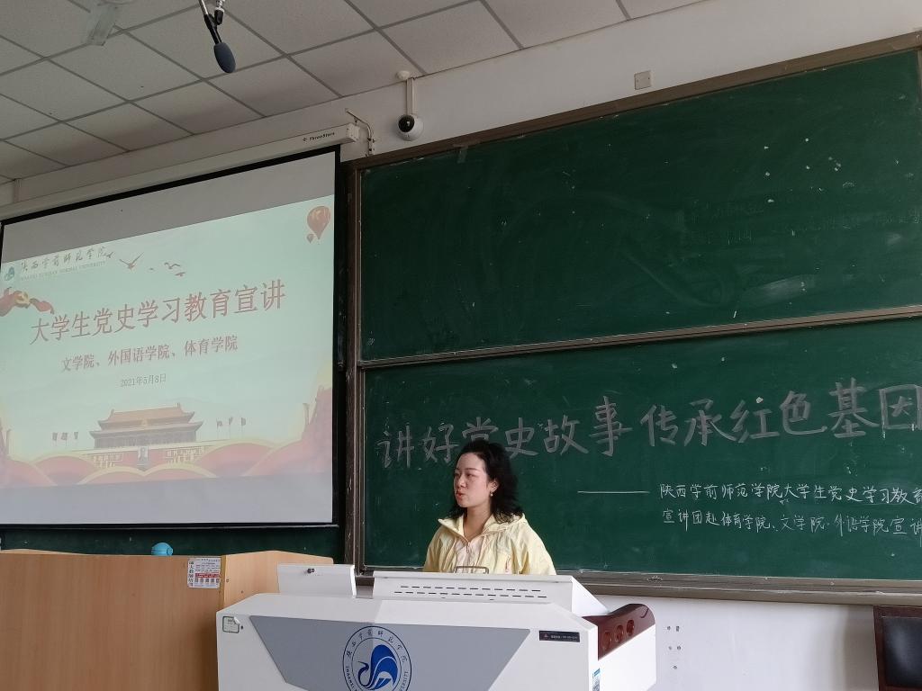 为了全面贯彻落实党史学习教育要求,铭记奋斗历程,强化理想信念,外国语学院学生党支部联合文学院、体育学院学生党支部,于5月8日下午召开了大学生党史学习教育宣讲会。宣讲会由外国语学院辅导员兼学生第一党支部书记陈燃、学校党史学习教育学生宣讲团杨小翠同学共同主持。本次宣讲会由宣讲员——马克思主义学院学生张鑫、王琳、李亚楠、高梦怡四名同学进行宣讲,三个学院的全体党员学生参加。