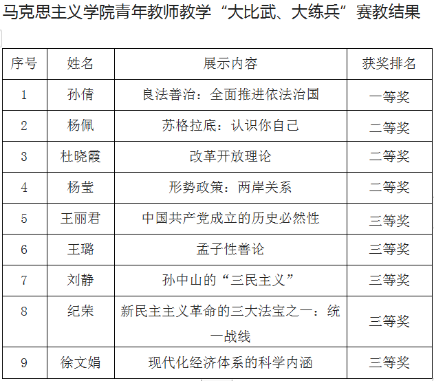 马克思主义学院历年重视青年教师的培养,近几年来开展多次大练兵活动,为青年教师提供了学习和锻炼的平台,营造了“以赛促教、以赛促该”的教学氛围。 此次青年教师教学“大比武、大练兵”活动既是对思政课教学改革的一次检阅,也是青年教师相互学习提升的一次机会。马克思主义学院教师将以此活动为契机,不断深化思政课改革创新,持续提高思政课教学水平。