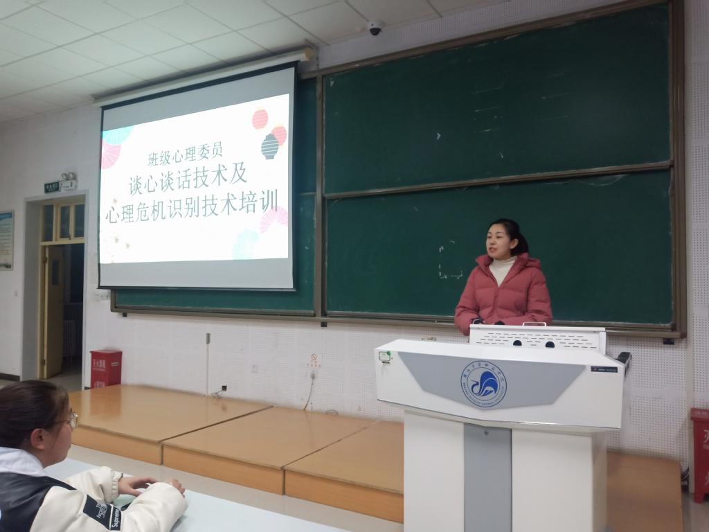 为充分发挥班级心理委员在大学生心理健康教育工作中的作用,进一步加强班级心理委员队伍建设,提高班级心理委员理论素养与工作能力;增强班级心理委员的责任意识,明确其工作职责,提高其业务水平,以更好的为班级学生服务。学生处于2020年12月24日晚7点至9点在积学楼C2阶梯教室举行了2020级班级心理委员培训班第二场讲座,本场讲座的主题为班级心理委员谈心谈话技术及心理危机识别技术。大学生心理健康教育与指导中心专职教师牛雪婷担任本次主讲。