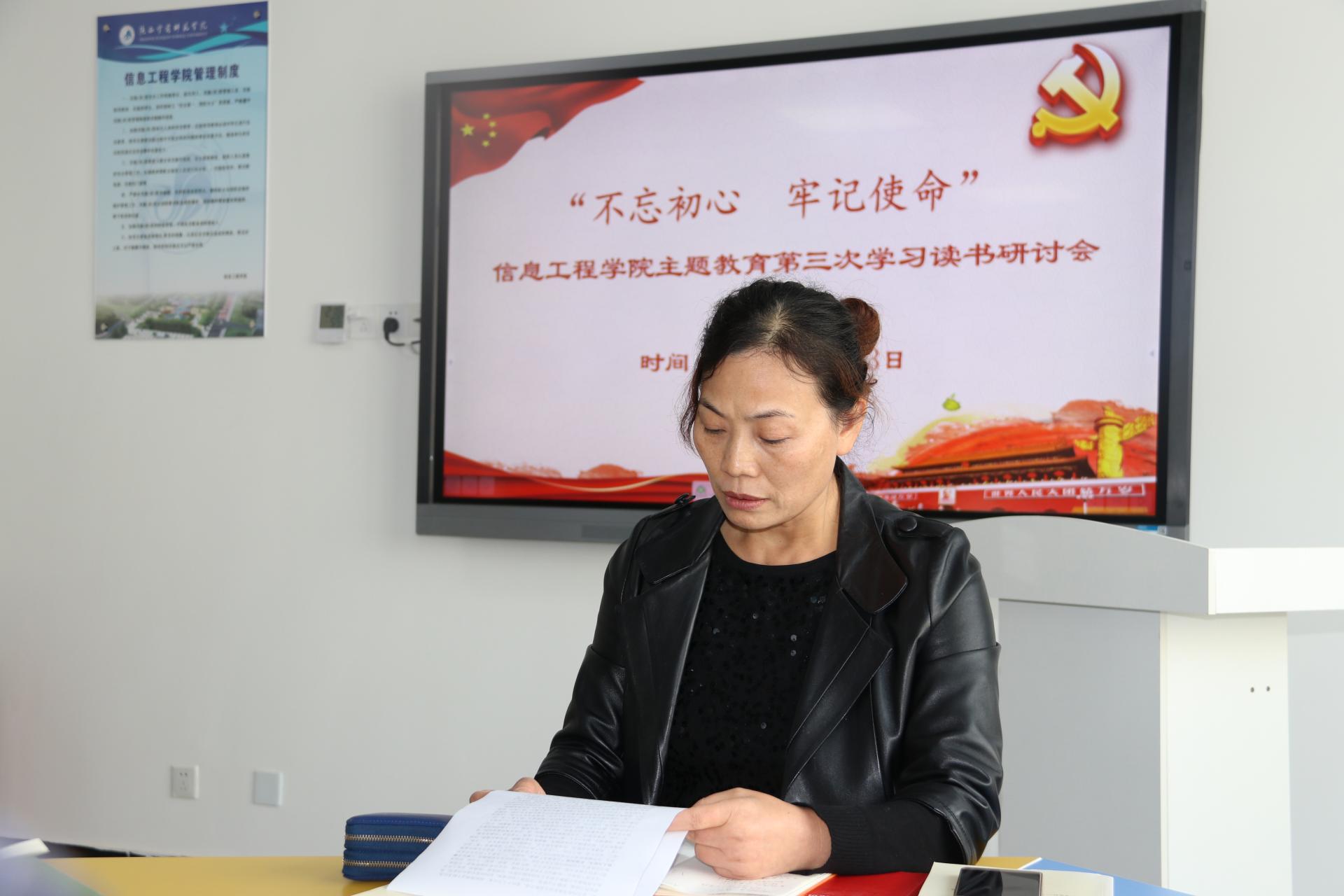为进一步深入开展 “不忘初心、牢记使命”主题教育学习,确保主题教育工作得到持续推进,根据学校《关于进一步做好bat365“不忘初心、牢记使命” 主题教育有关工作的通知》要求,10月23日下午,信息工程学院党总支在2教A404召开了“不忘初心、牢记使命”主题教育第三次学习读书研讨会,全体教工参加了会议,会议由党总支书记薛晓娟主持。