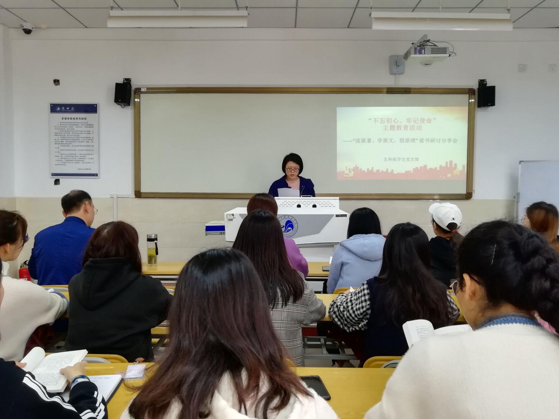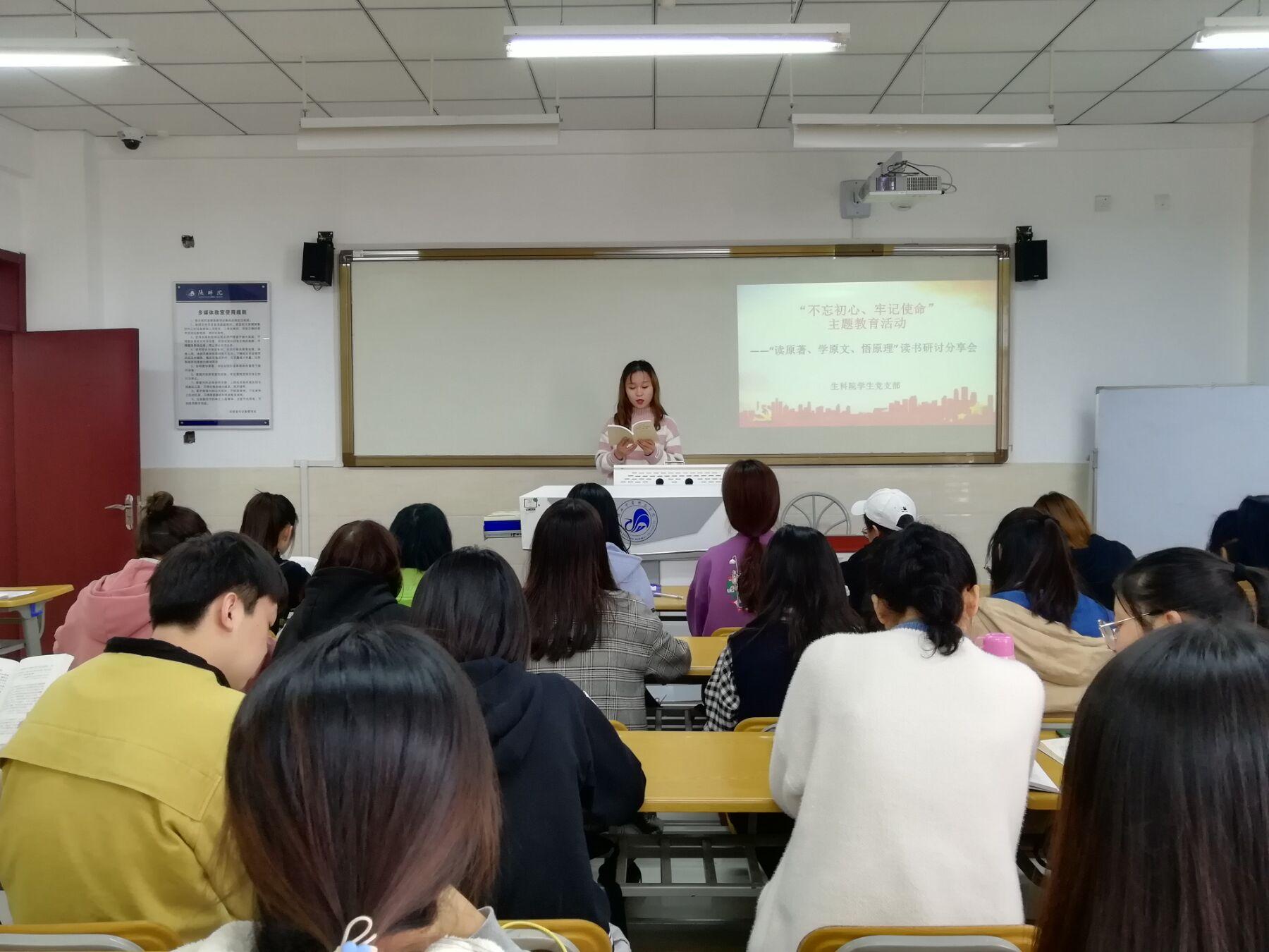 贯彻落实“不忘初心、牢记使命”主题教育有关部署要求,切实推动我院全体学生党员静心凝神读原著、学原文、悟原理。2019年10月19日,生命科学与食品工程学院学生党支部在四号教学楼302教室召开“不忘初心、牢记使命”主题教育——“读原著、学原文、悟原理”读书研讨分享会,参加本次活动的有生科院党总支副书记、学生党支部书记。