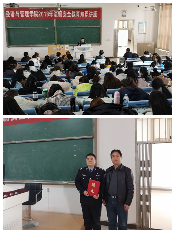 2018年11月28日下午14:00,经济与管理学院在一号教学楼B3阶梯教室开展主题为《弘扬士人精神,引进中华法治文明》的法制安全教育知识讲座。聆听此次讲座的有经济与管理学院党总支书记、副书记、全体辅导员、学生会干部及2018级新生。